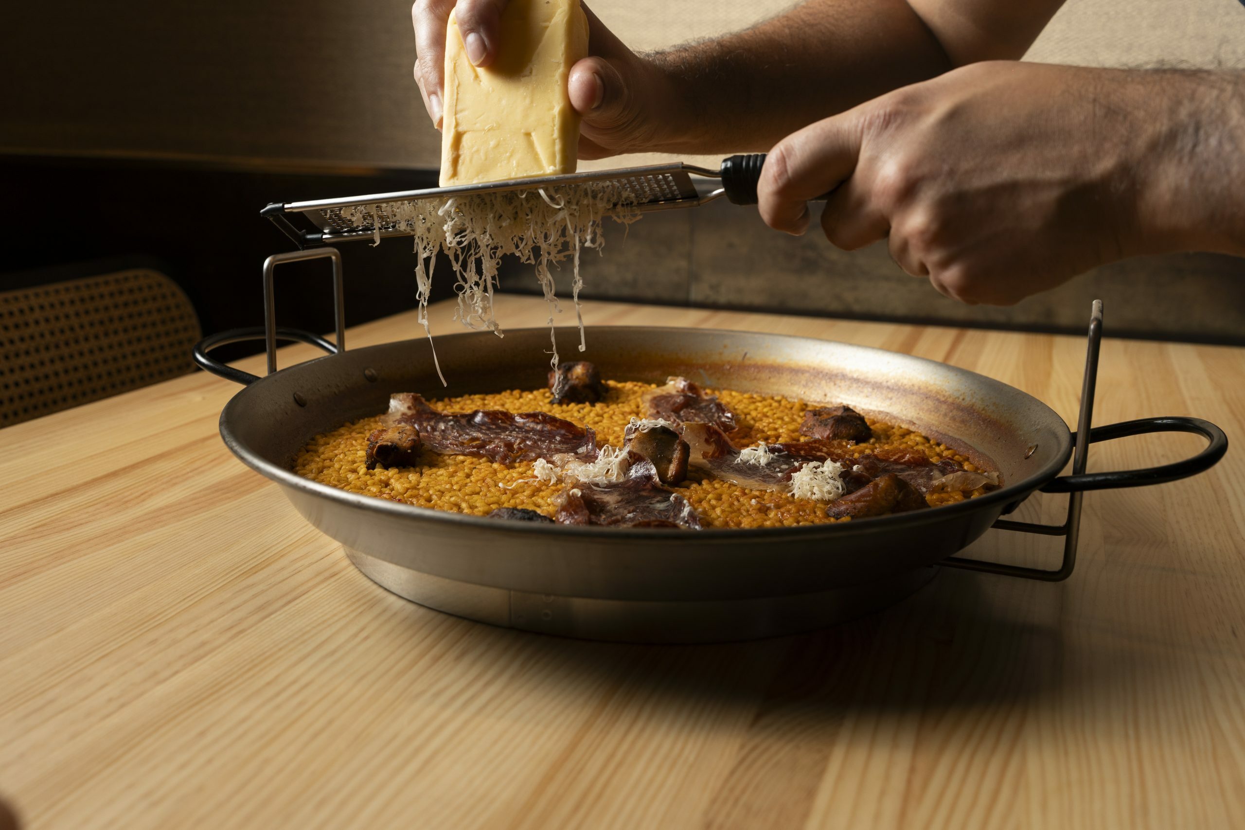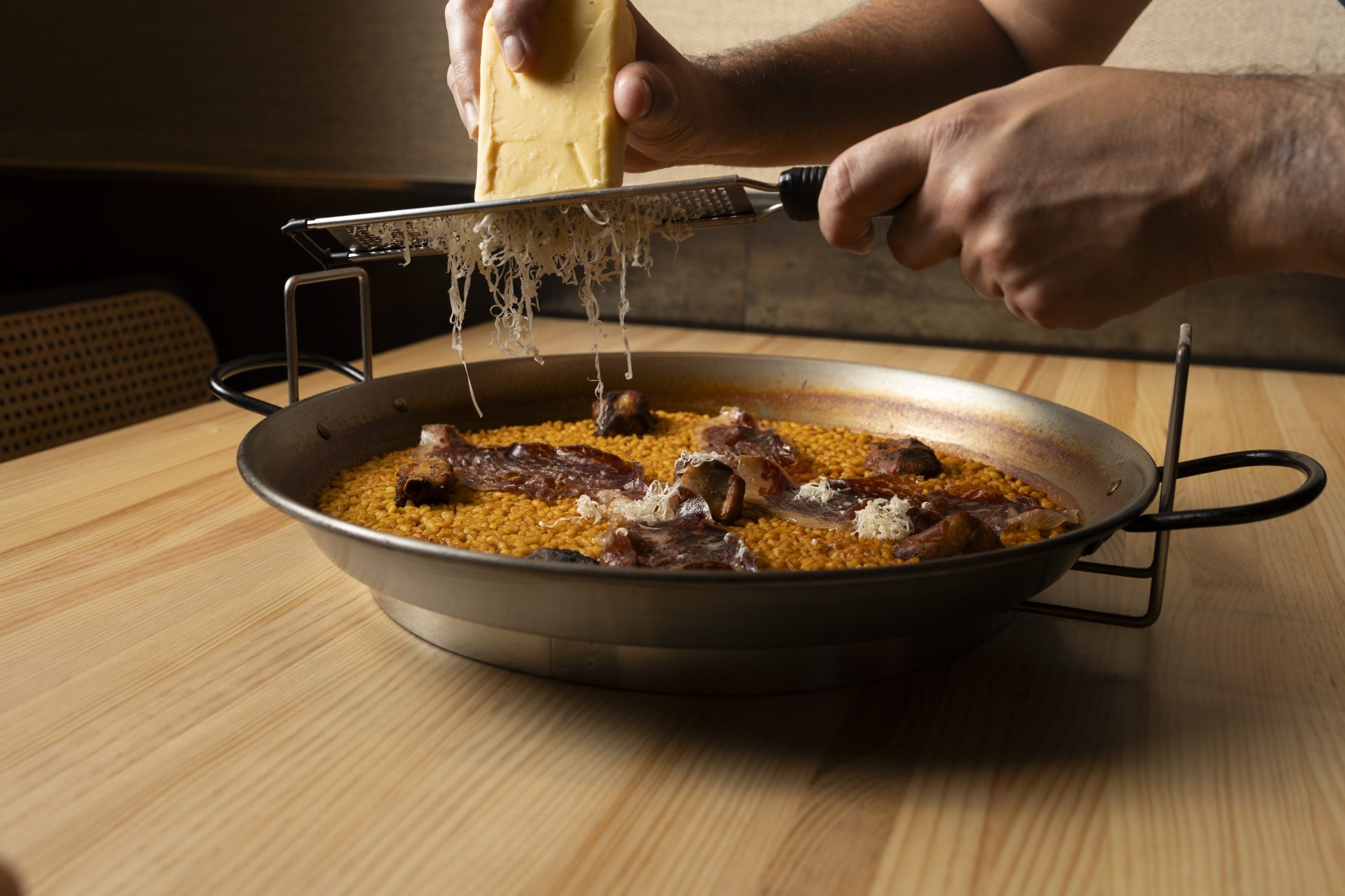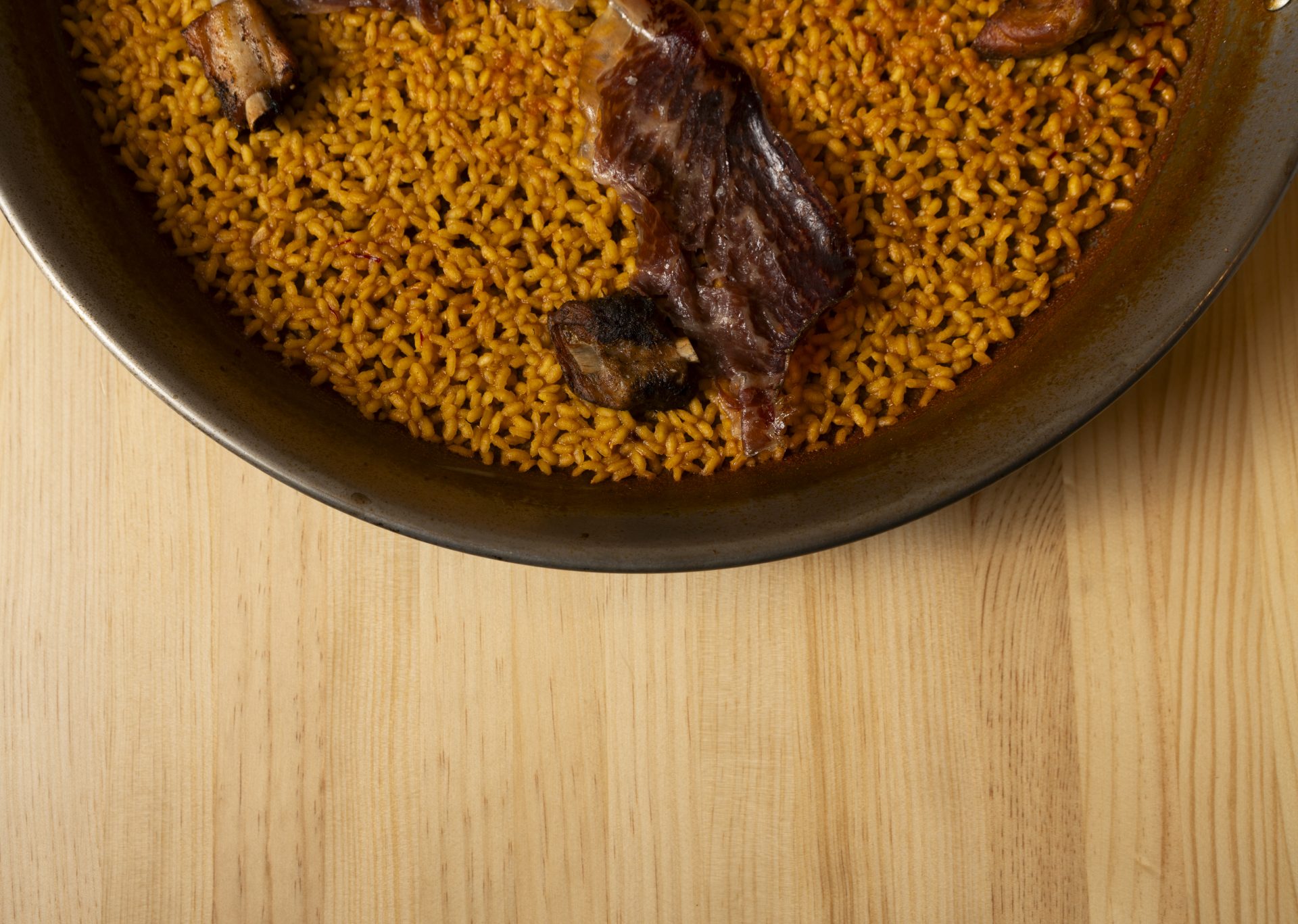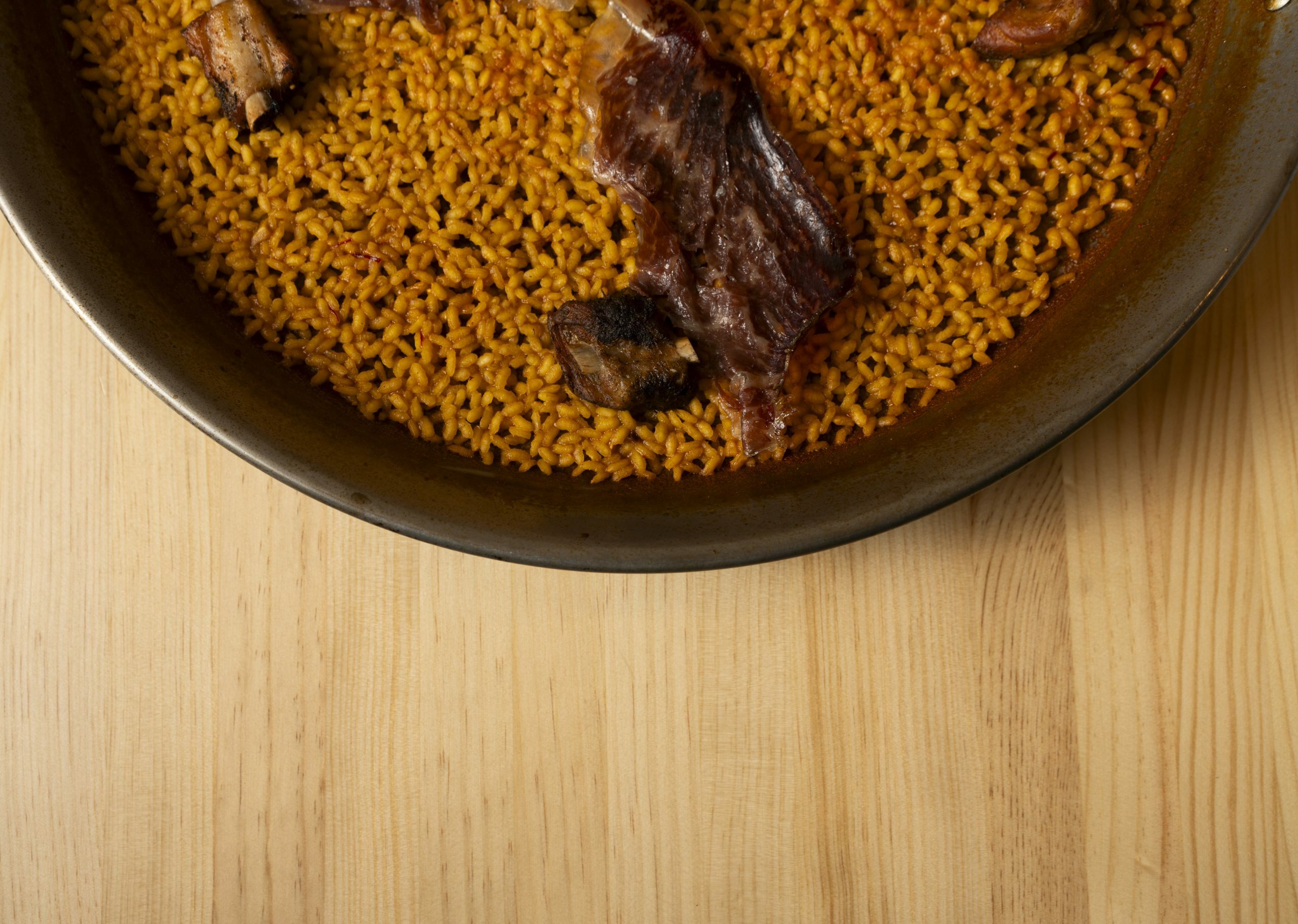 Arroz seco de costillas confitadas a baja temperatura, cecina de angus y mantequilla ahumada